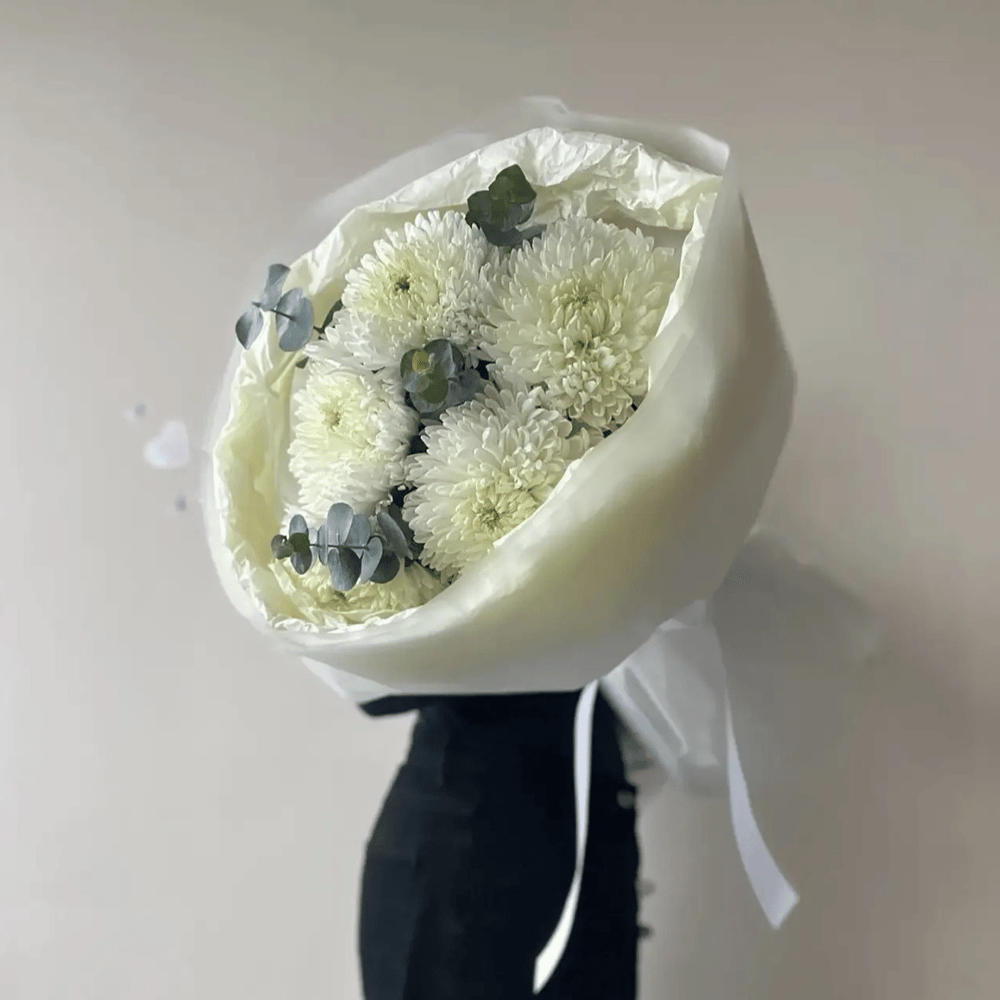 Элегантный букет из пяти крупных хризантем Магнум и ветвей эвкалипта, аккуратно собранных в современную матовую упаковку. Дополняет композицию нежная тишь — символ спокойствия и гармонии. Идеальный подарок или акцент в интерьере, подчеркивающий изысканный вкус и утонченность.