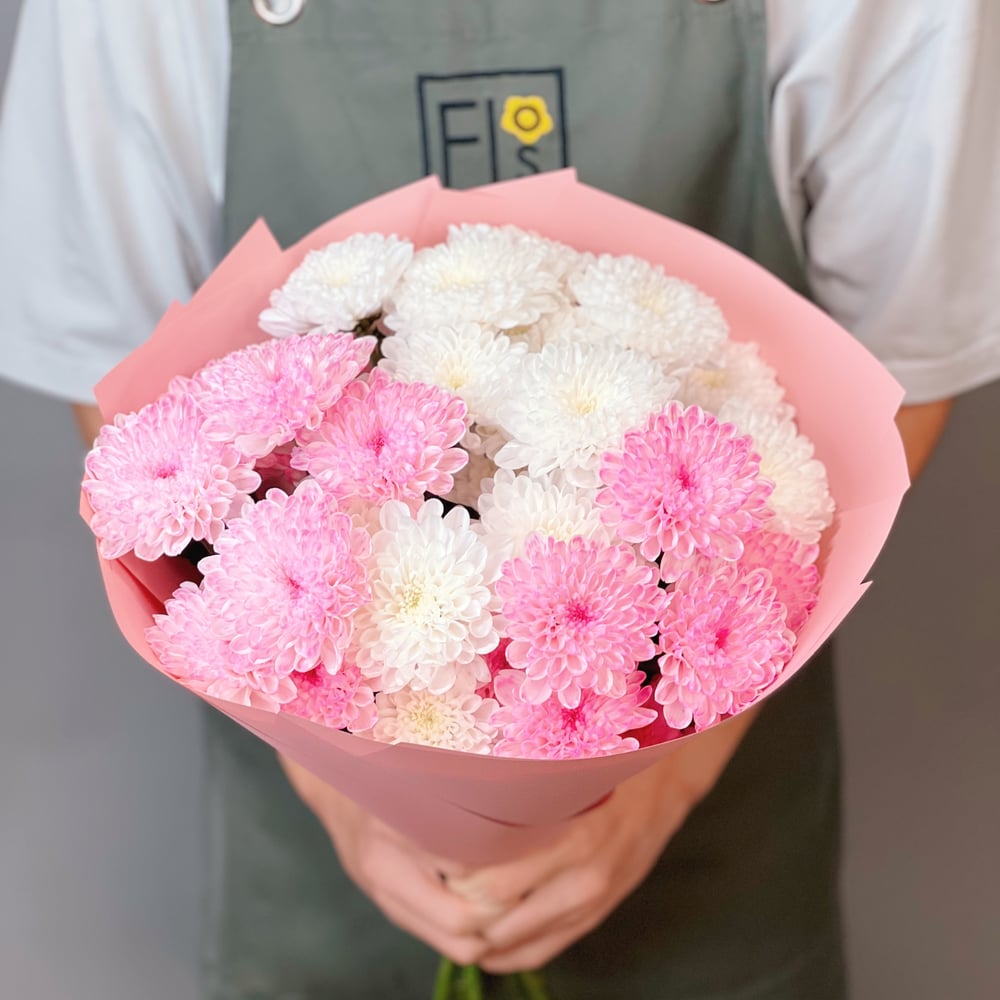 Монобукет из 5 кустовых хризантем сорта Алтай в бело-розовой гамме, в подарочной упаковке, оформленный атласной лентой.