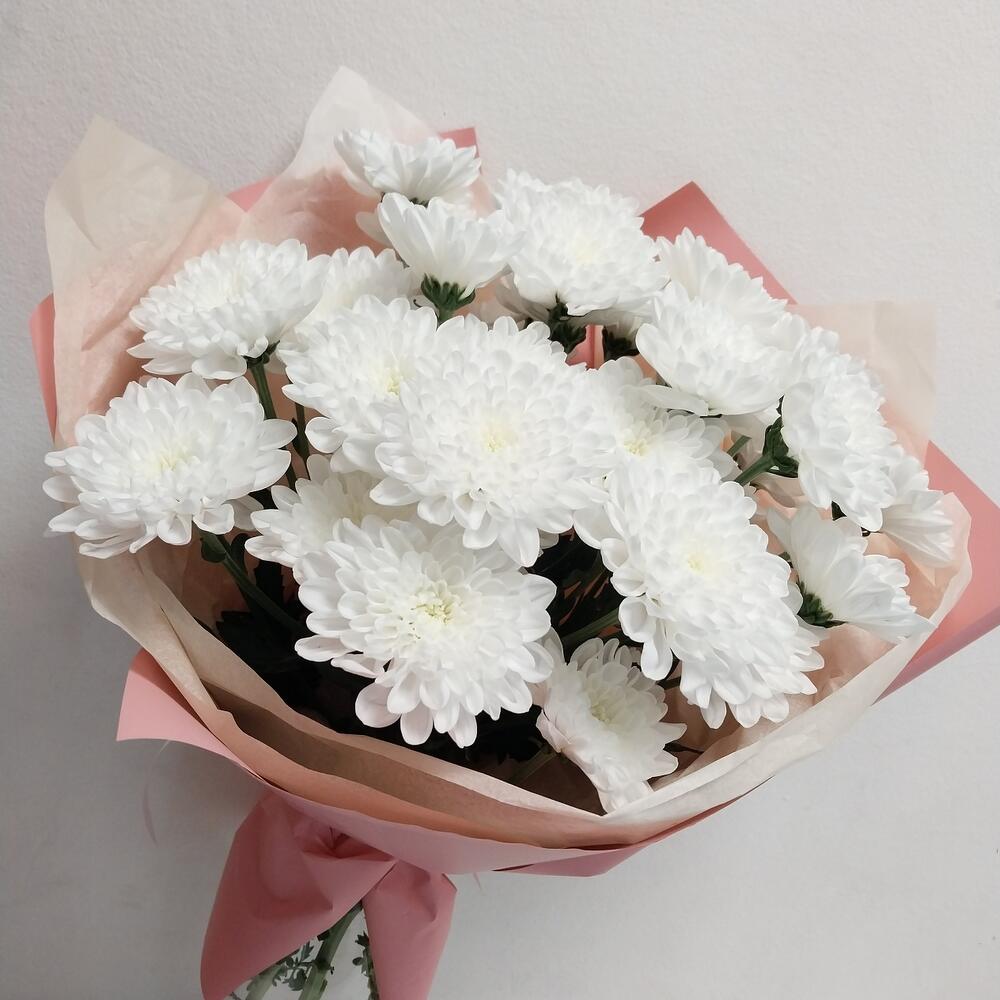 Невероятно нежный и стойкий букет из 5 белых хризантем.