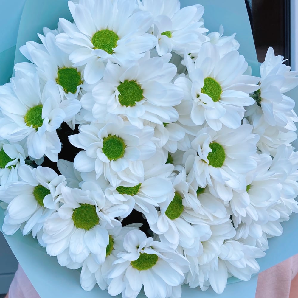 Монобукет из 5 кустовых хризантем ромашкой, в подарочной упаковке, оформленный атласной лентой.