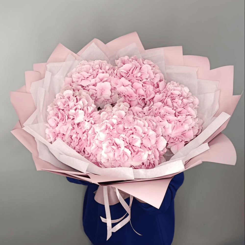 Классический букет из 5 розовых гортензий в цветном крафте с атласной лентой. Букет состоит из 5 розовых гортензий, которые являются символом любви и нежности. Высота букета составляет 50 см, ч…