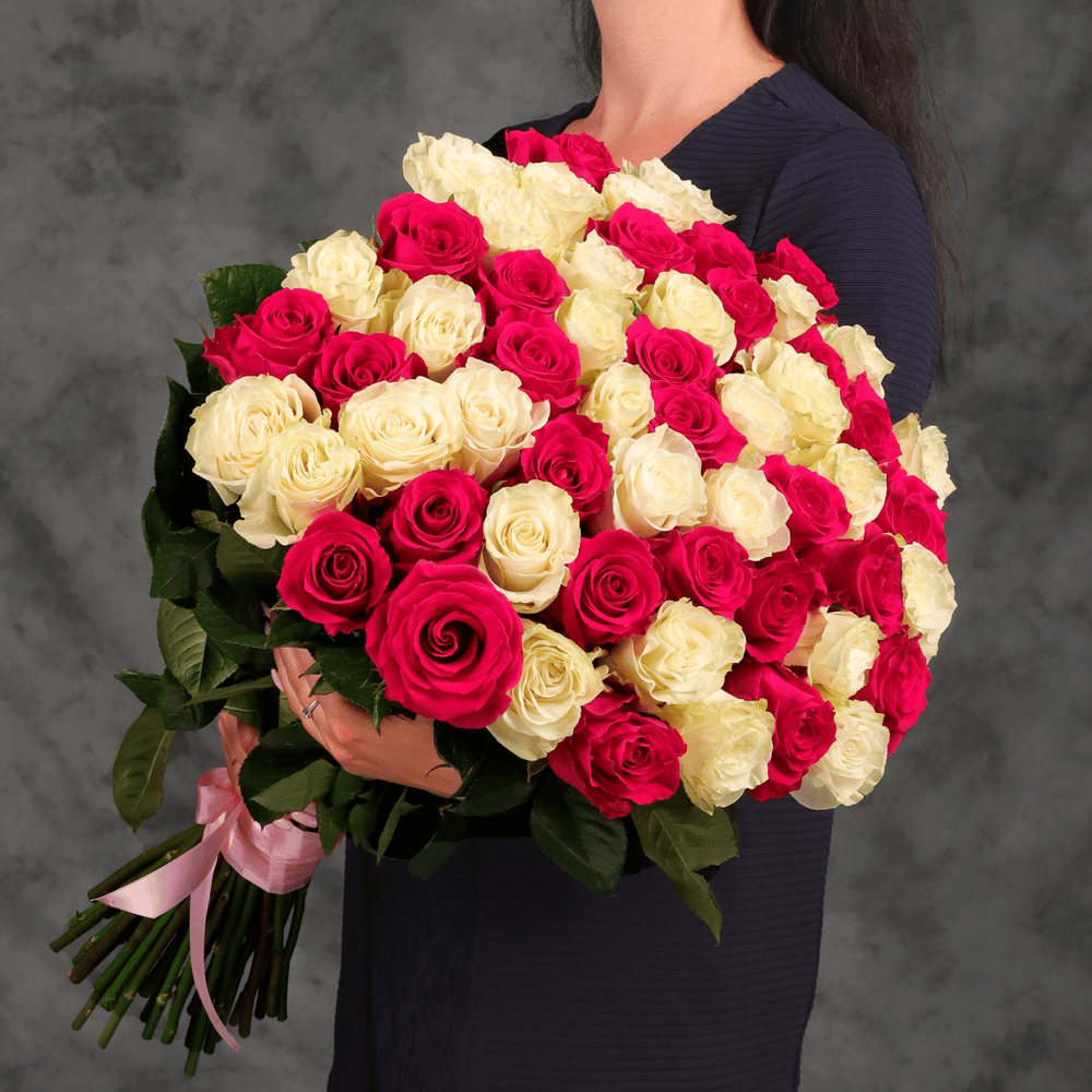 Классический букет из 51 белой и розовой эквадорской розы 60см с атласной лентой от 2name flowers букет из 51 белой и розовой эквадорской розы, сорта мондиаль и пинк флойд, станет прекрасным подар…