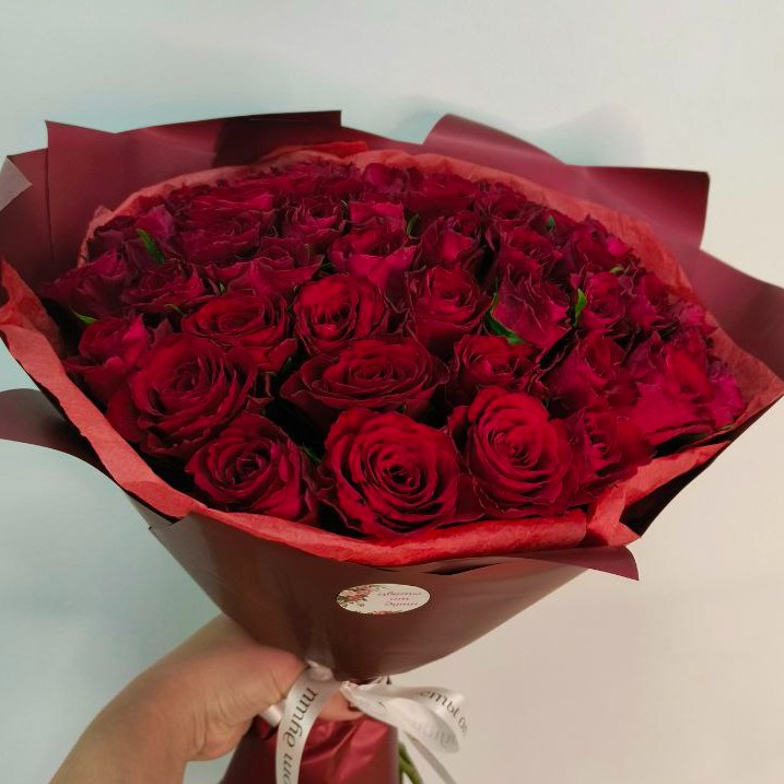 Покорите ее сердце роскошным букетом из 51 свежей красной кенийской розы. Элегантная дизайнерская упаковка с тишью подчеркивает изысканность подарка. В подарок – кризал для продления жизни розам и…