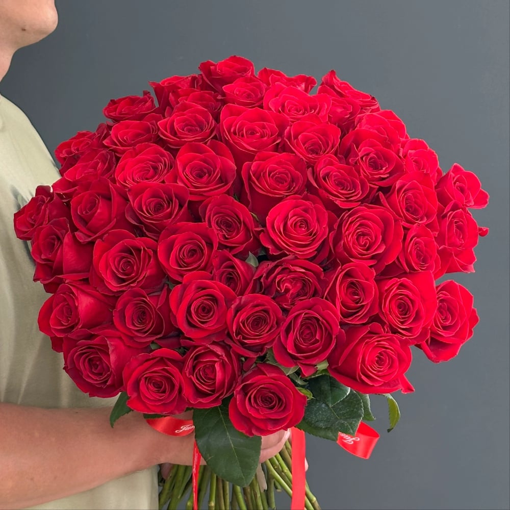 51 алая роза — символ искренней любви и благодарности за встречу, которая изменила жизнь. Пышные бархатные бутоны в обрамлении сочной зелени создают образ страсти и нежности одновременно. Этот буке...