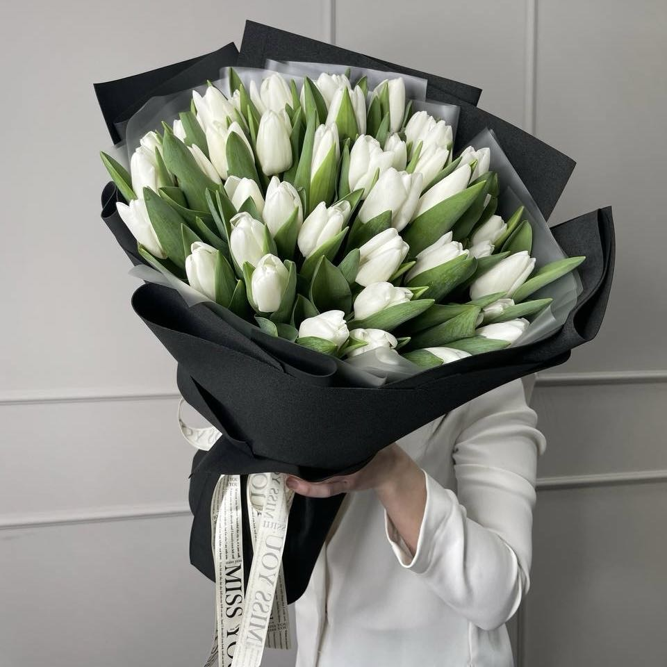 букет из 51 тюльпана с оформлением в черную упаковку 🖤