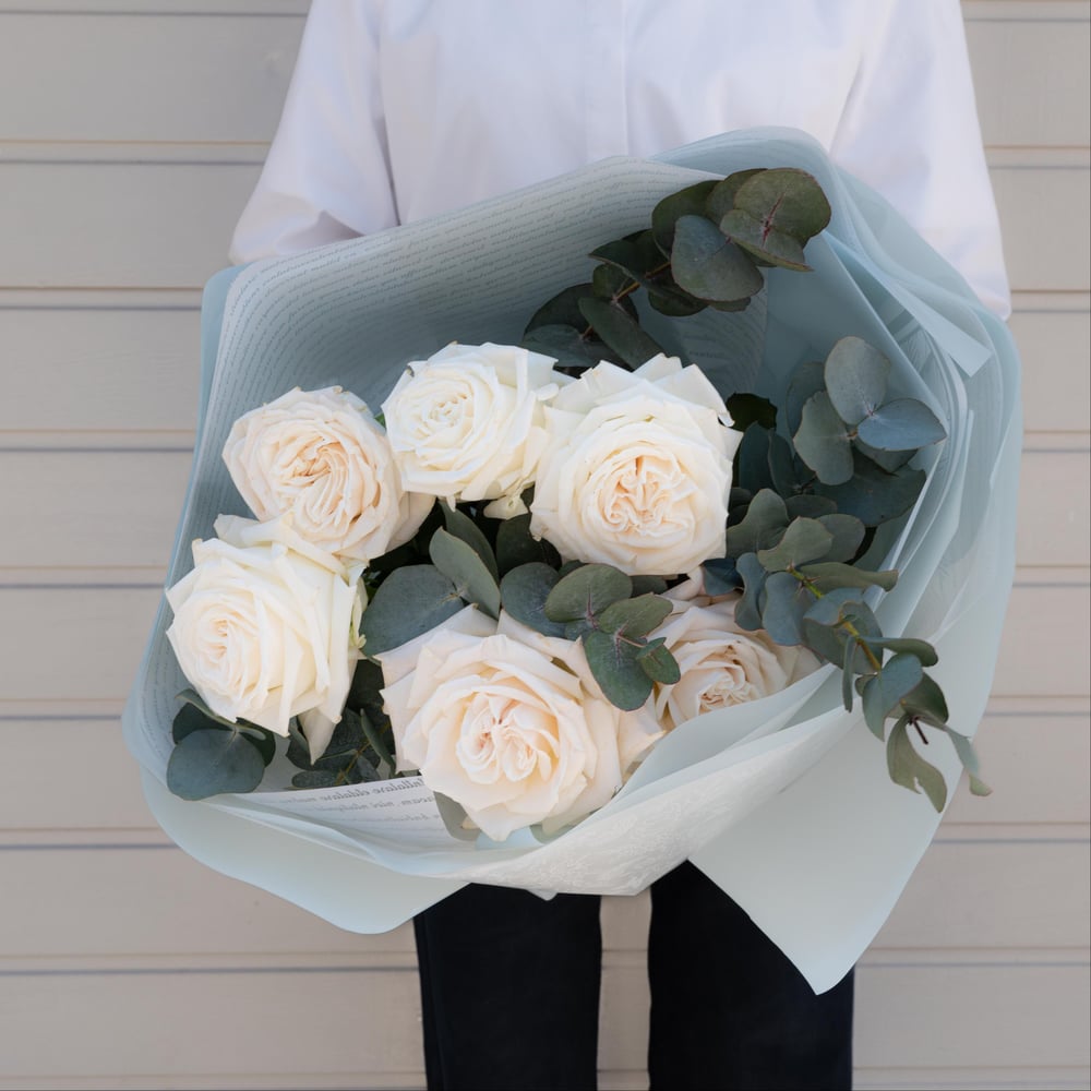 Монобукет "Благородное молчание" - это симфония белого цвета и безупречного стиля. Семь белоснежно-нежных французских роз Playa Blanca, словно жемчужины, собраны в изысканную композицию. Их лепестки белого оттенка, безупречные и совершенные, рассказывают историю без слов. Свежий аромат эвкалипта добавляет букету особую глубину, создавая гармоничное звучание природы, а многослойная упаковка эколюкс подчеркивает элегантность композиции, становясь её достойным обрамлением. Этот букет - воплощение сдержанной роскоши и утонченной красоты. Он говорит о многом, не произнося ни слова, даря получателю ощущение изысканной простоты и благородства. “Благородное молчание” - для тех, кто ценит истинную красоту в её чистом, незамутненном виде. Для тех, кто понимает, что иногда самые важные чувства можно выразить без слов. Размеры: диаметр до 50 см., высота до 50 см. Состав: французские розы Playa Blanca - 7 шт., эвкалипт - 5 шт., упаковка, ленты