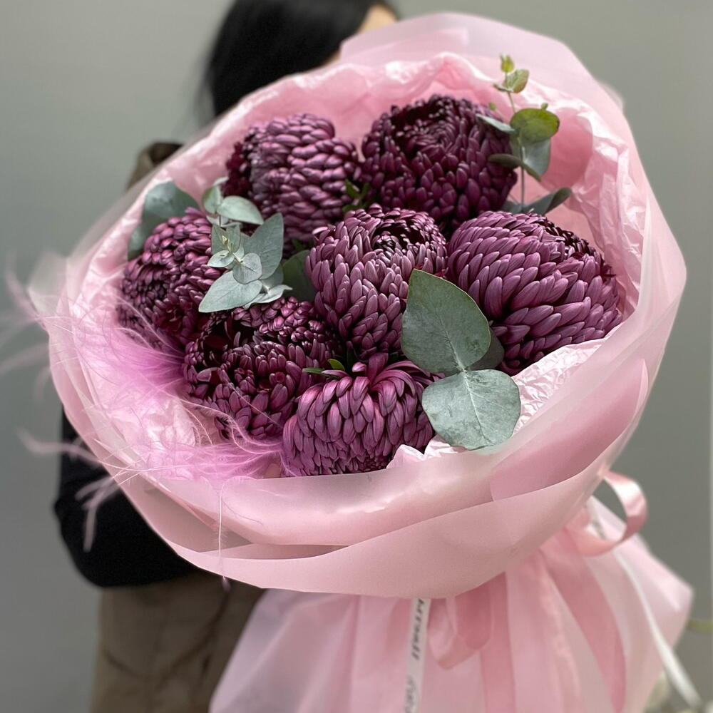 Букет из 7 хризантем сорта Бигуди винного цвета Великолепный букет, состоящий из семи насыщенных винных хризантем сорта Бигуди. Эти крупные, пышные цветы привлекают внимание своей глубиной оттен...