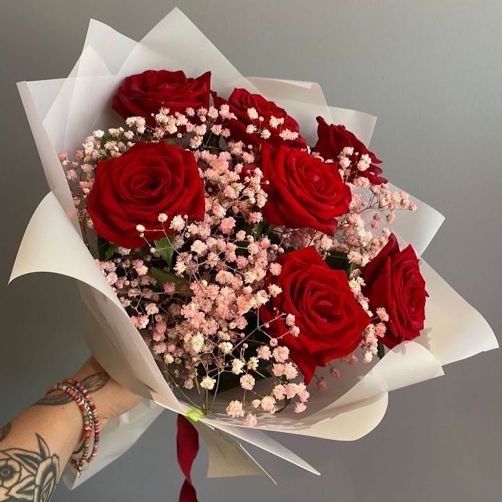 Букет из 7 шикарных красных роз с веточками гипсофилы в авторской упаковке