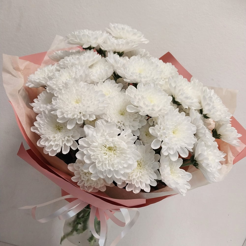 Невероятно нежный и стойкий букет из 7 белых хризантем.