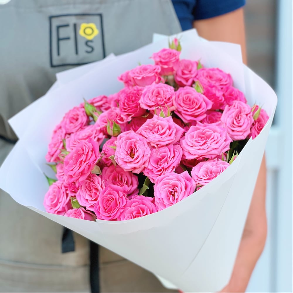 Монобукет из 7 кустовых роз сорта Лиана, в подарочной упаковке, оформленный атласной лентой.