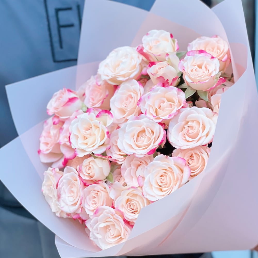 Монобукет из 7 кустовых роз сорта Рефлекс, в подарочной упаковке, оформленный атласной лентой.