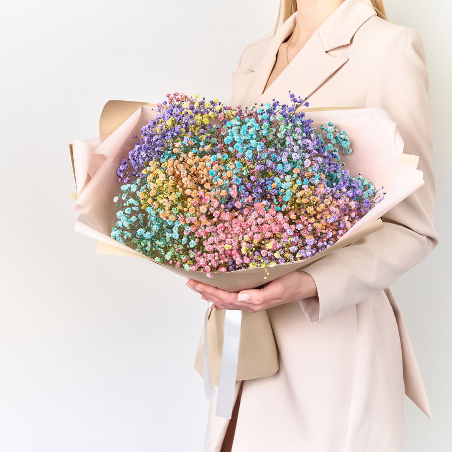 Букет из 7 разноцветных гипсофил станет хорошим подарком абсолютно для всех! Гипсофила - сухоцвет, поэтому она может жить и без воды, естественно высыхая со временем, практически в неизменном виде. Тем не менее, мы рекомендуем ставить букет в воду, чтобы гипсофила не сохла и дольше радовала получателя своим видом.