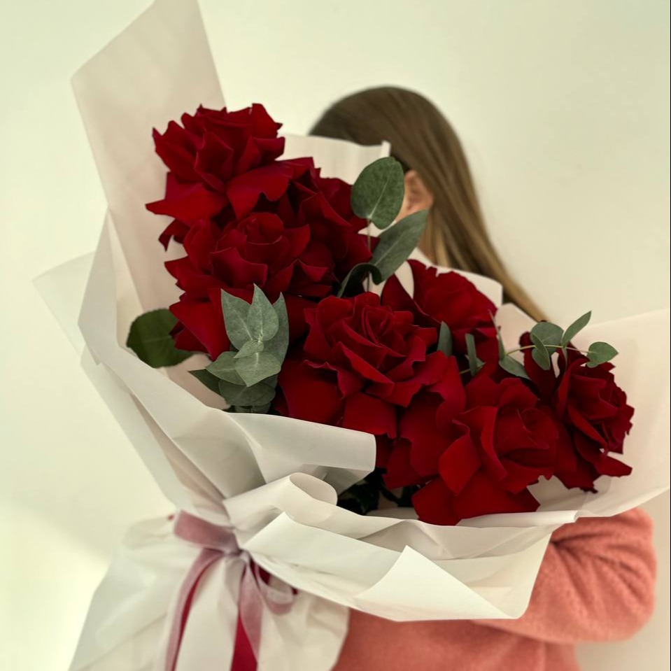 Букет из 7 русских роз с эвкалиптом