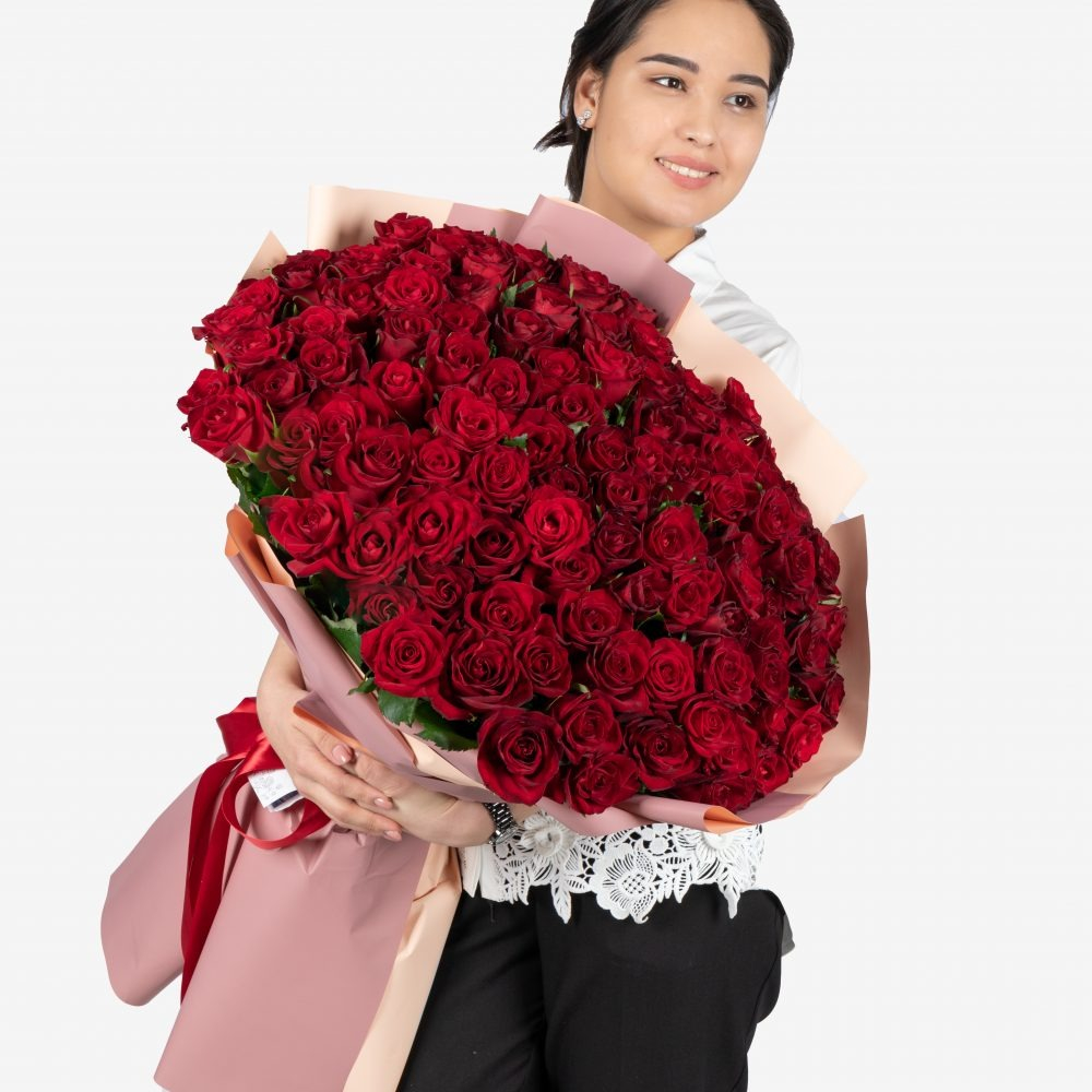 Букет из роз, оформленные в фирменную упаковку и перевязан лентой.