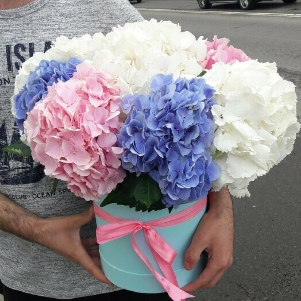 Шляпная коробка с цветами «Букет из 9 Гортензий»