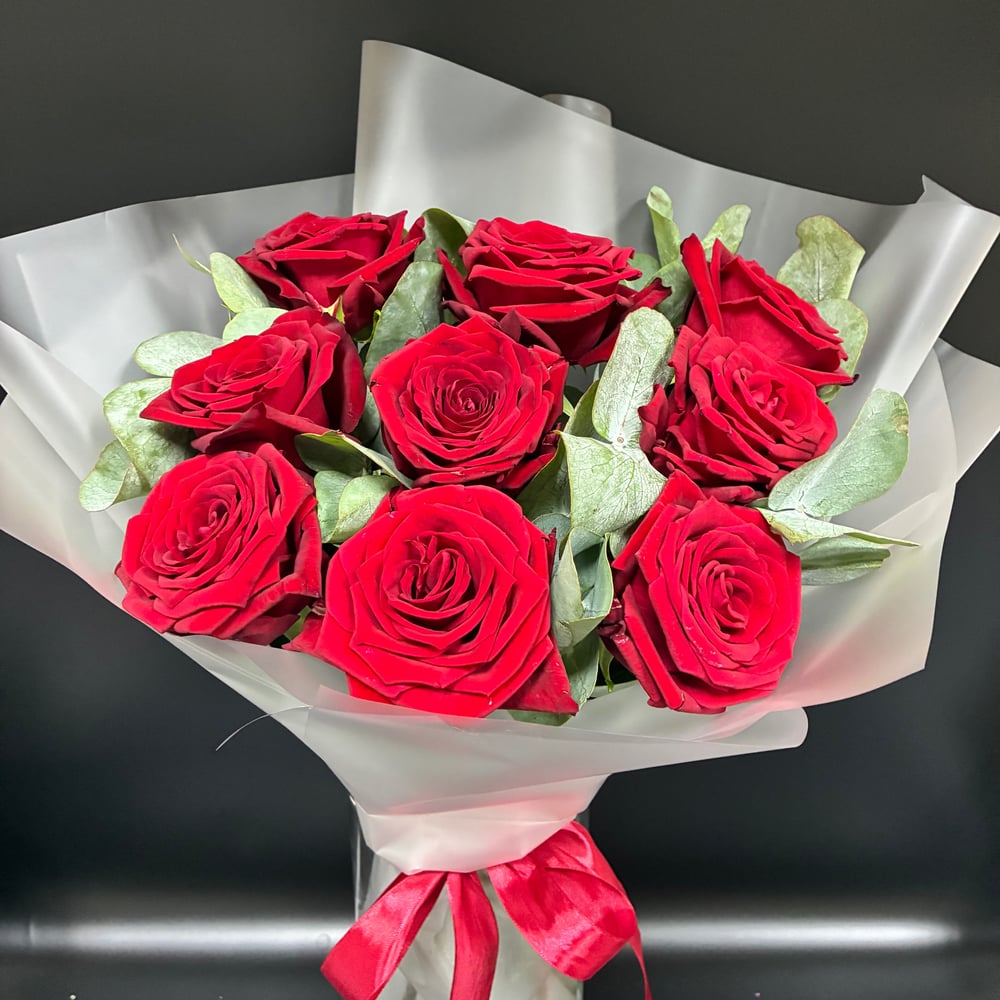 Изысканный букет из 9 роскошных красных роз с благородным эвкалиптом - воплощение страсти и элегантности. Размер композиции: ширина 30-33 см, высота 50см. Особенности букета: Премиальные розы с…