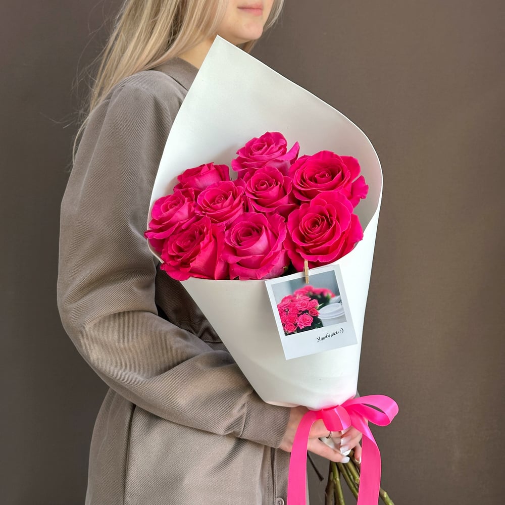 Этот изысканный букет состоит из 9 роз сорта Pink Floyd — ярких, насыщенного цвета фуксия. Розы этого сорта отличаются крепкими стеблями и крупными, пышными лепестками, которые создают эффектный и элегантный образ.