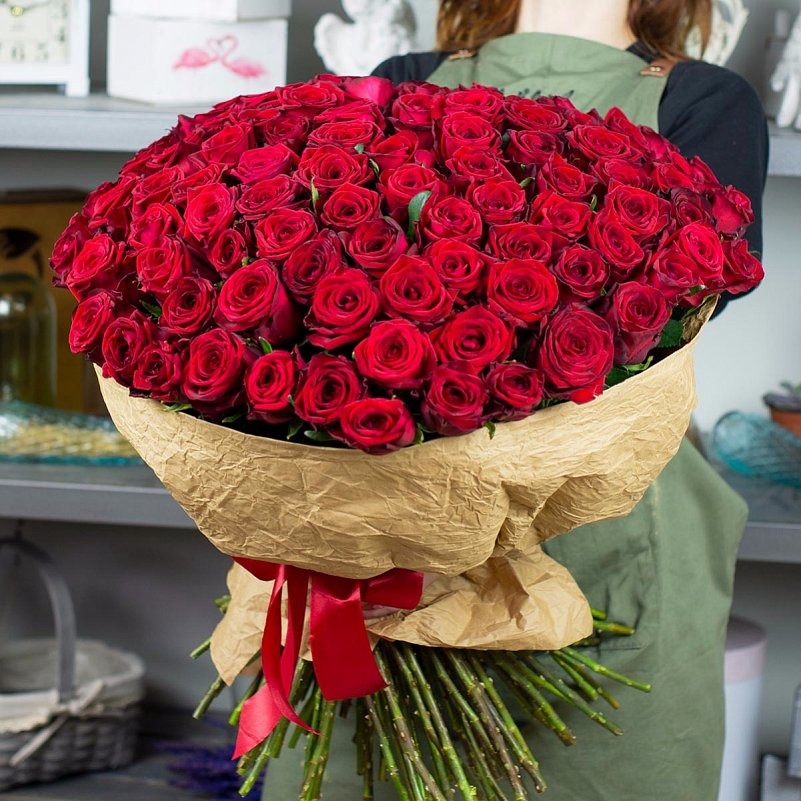 Букет из роз, оформленные в фирменную упаковку и перевязан лентой.