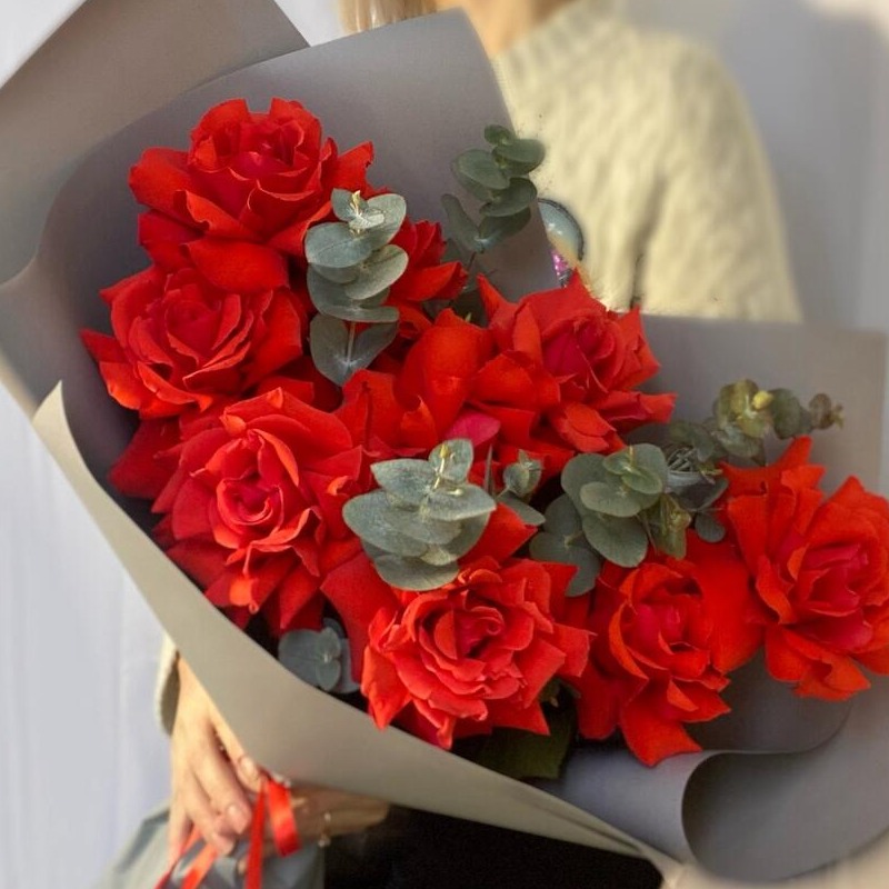 Очень стойкая роза сорта Нина с добавлением эвкалипта, в стильной серой упаковке, подойдет на любой возраст и любой повод