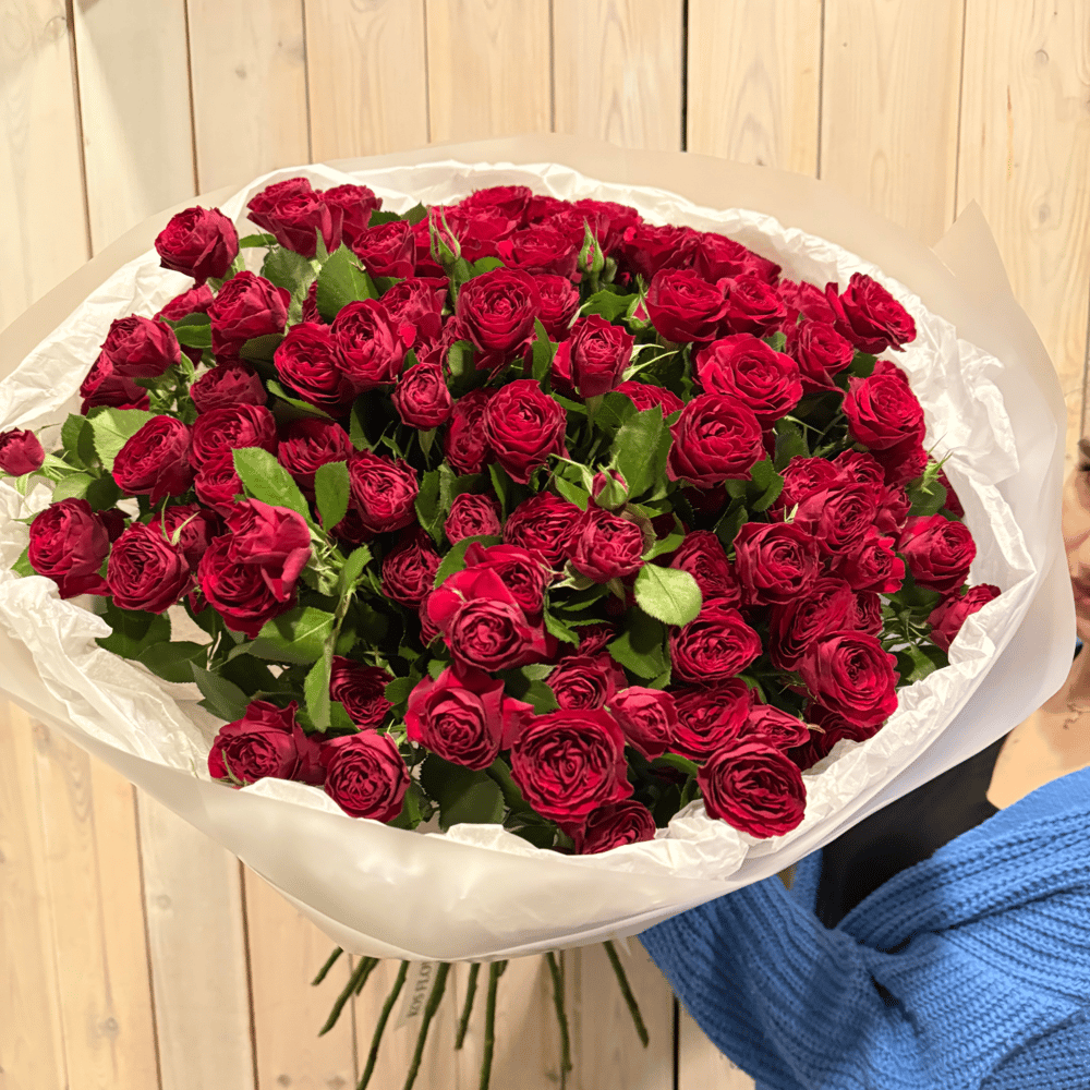 Букет из алых кустовых роз в нежной упаковке 🌿 Отличный подарок по любому поводу и без! 🥰