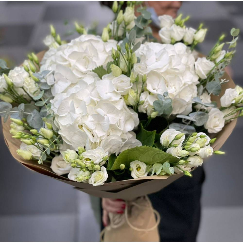 Букет из 3 белых гортензий, 10 ветвей белой эустомы, 4 веток эвкалипта в стильном оформлении