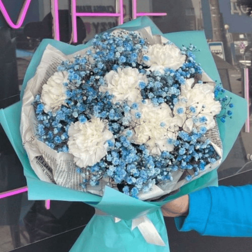 Букет из белых диантусов и гипсофилы в авторской упаковке