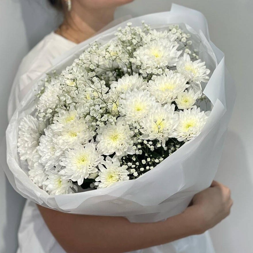 Букет из белых хризантем и гипсофилы