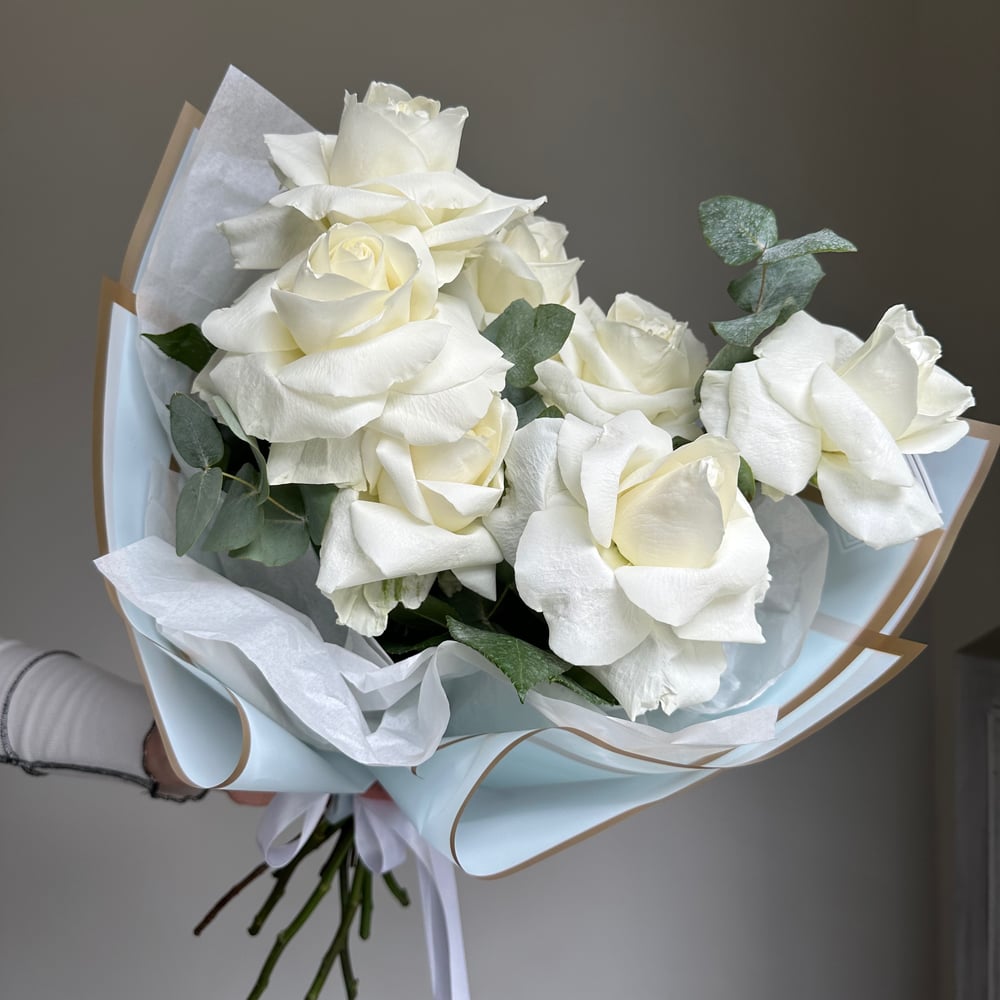 Очаровательный букет из белых роз и эвкалипта. Изящный презент для ваших любимых
