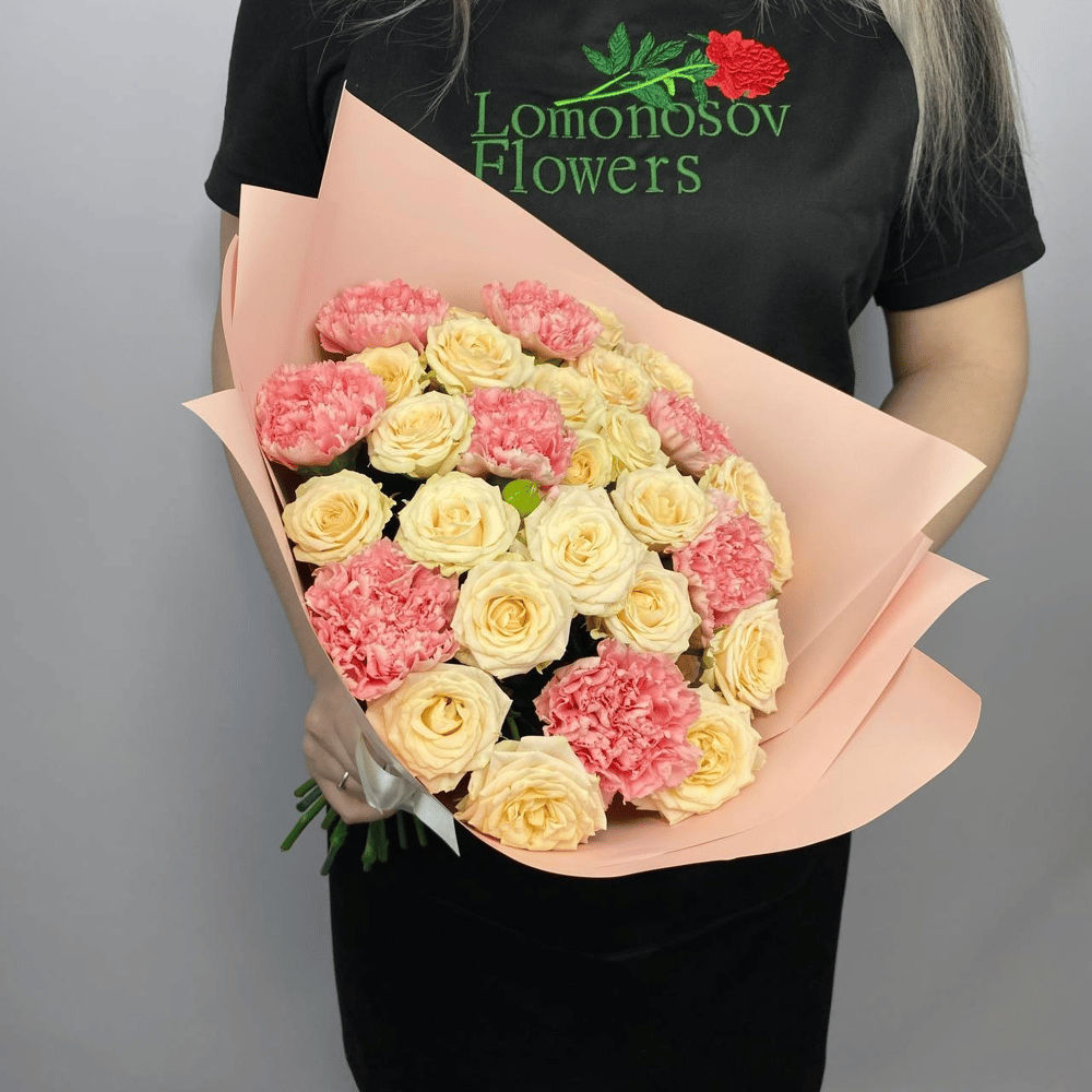 Авторский букет из розовых диантусов и бежевых кустовых роз в фирменной упаковке. 🎁 В подарок к букету Вы получите: - фирменную открытку с Вашими пожеланиями - инструкцию по уходу за букетом - подкормку для срезанных цветов
