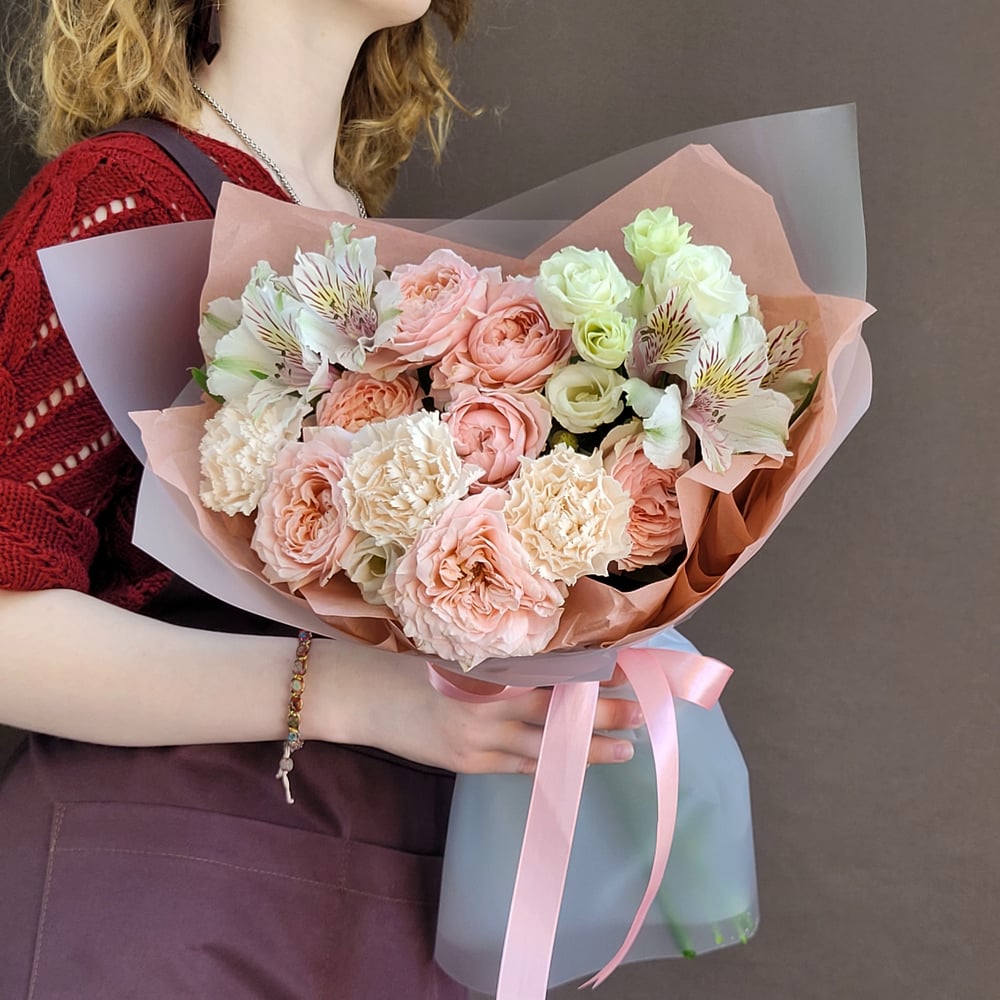 Этот изящный букет сочетает в себе нежные оттенки различных цветов. В его состав входят ароматный диантус, нежные альстромерии, элегантные лизиантусы (эустомы) и прекрасные кустовые розы. Букет упа...