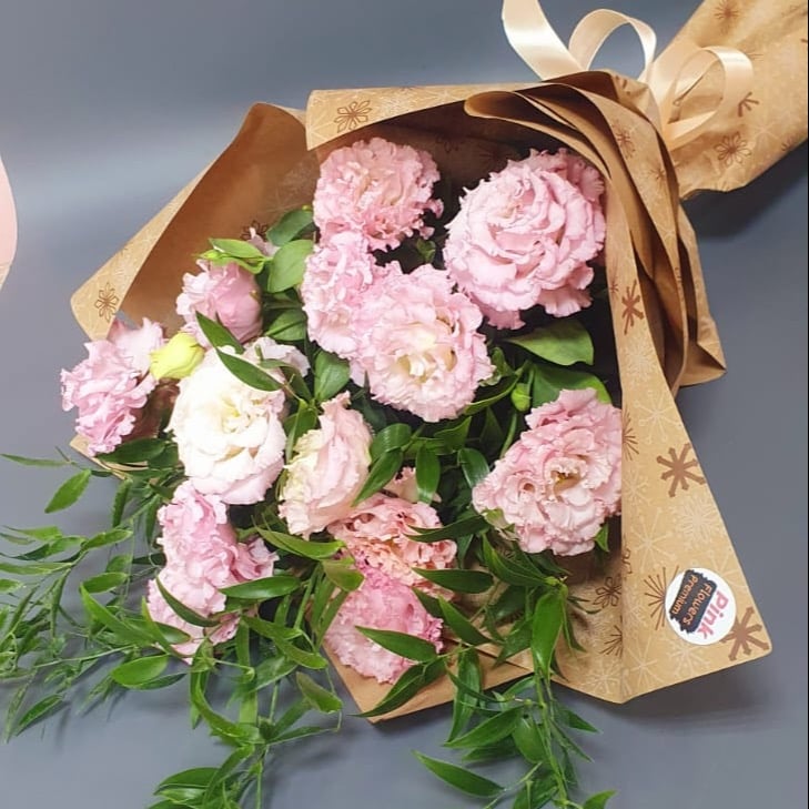 Этот изысканный букет сочетает в себе нежность эустомы и зелёную свежесть рускуса, создавая гармоничный и элегантный образ. Легкие, как облака, цветы эустомы с их многослойными лепестками в пастель...