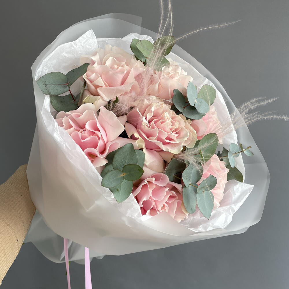 Букет из французских роз — это воплощение элегантности и изысканности. В букете гармонично сочетаются нежные французские розы, свежие листья эвкалипта и тонкие стебли ковыля. Это создаёт ощущени...