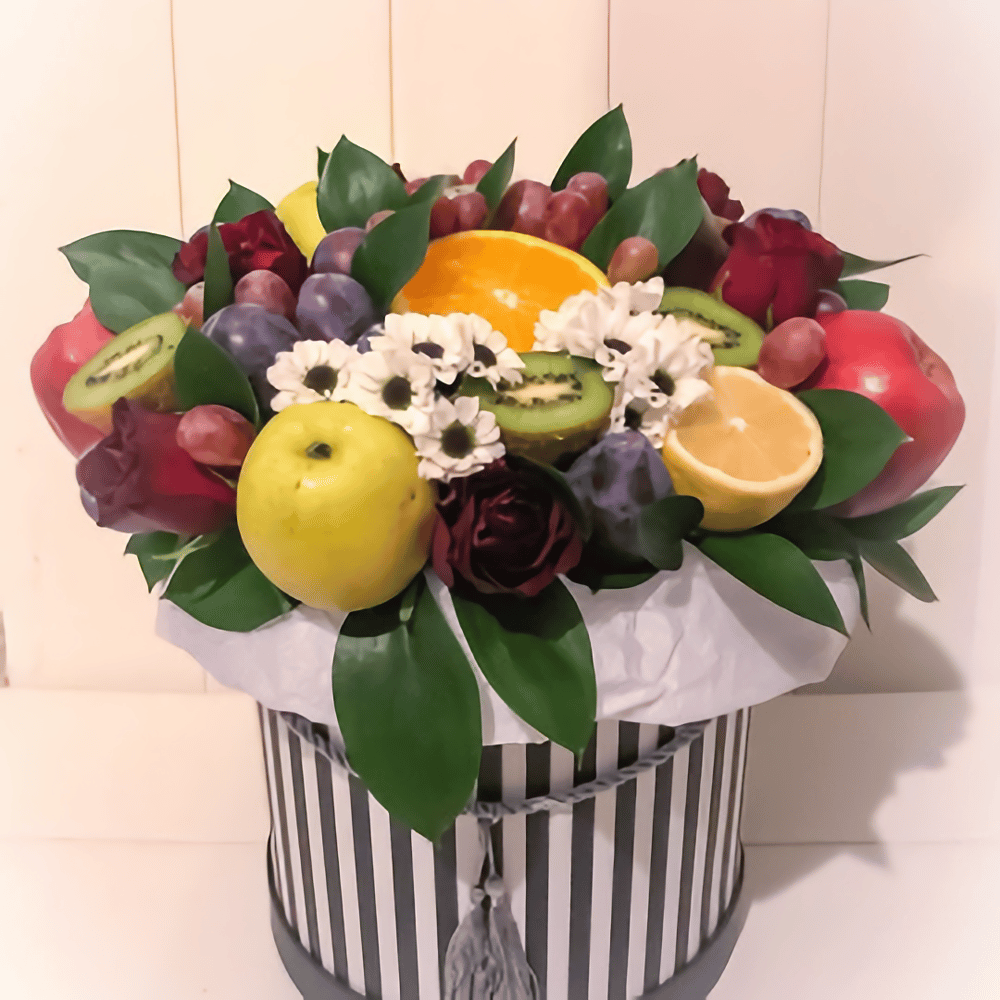 Букет из фруктов и цветов в коробке