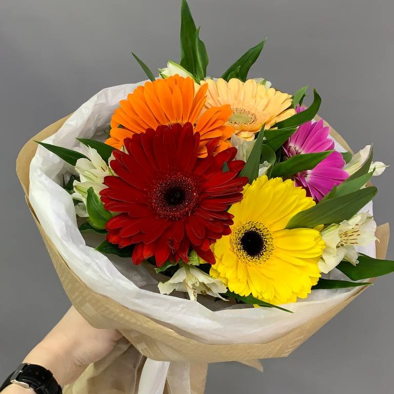 Милый букет-комплимент из красочных гербер и нежных альстромерий! Прекрасный эффектный подарок на день рождения, свадьбу, годовщину, день свидания или знакомства или просто как знак внимания по л...