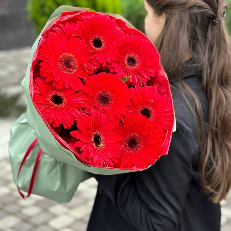 Яркий букет из девяти красных бархатистых гербер, упакованный в стильную дизайнерскую пленку. Этот букет принесет радость и улучшит настроение своему получателю, добавив яркие краски и позитивные э...