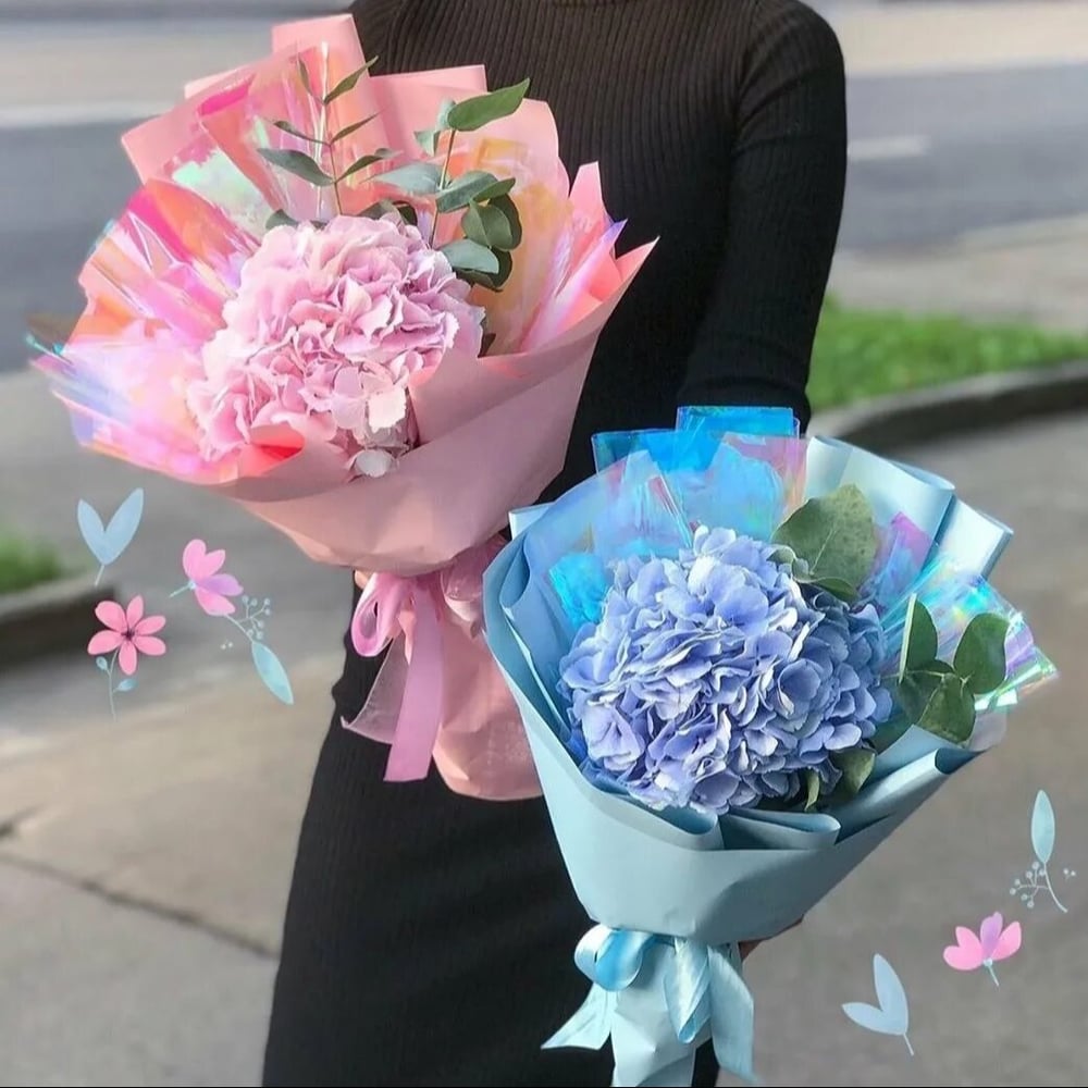 Этот прекрасный букет включает в себя одну главную цветочную составляющую - гортензию, или гидрангию, как она также известна. Гортензия - это изящное растение с большими, пышными соцветиями из множ...