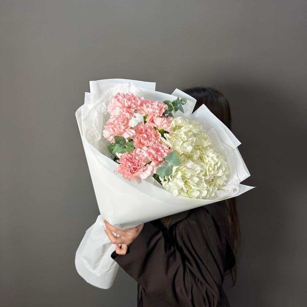 Букет, составленный из гортензий и диантусов, представляет собой очаровательную композицию, полную легкости, объема и нежной текстуры. Это сочетание создает эффект воздушности и пышности с деликатн...
