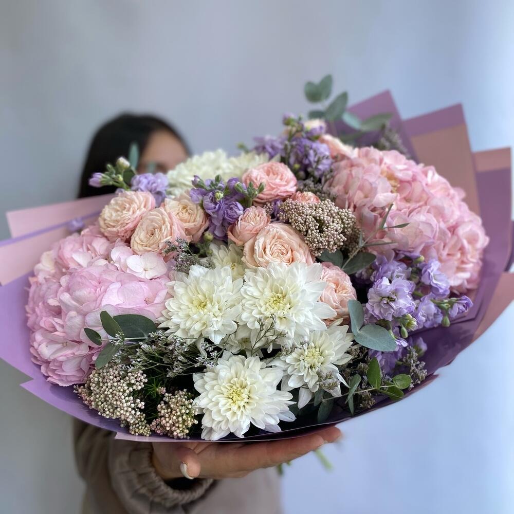 Букет из гортензии и ароматной маттиолой из роз и экзотических цветов