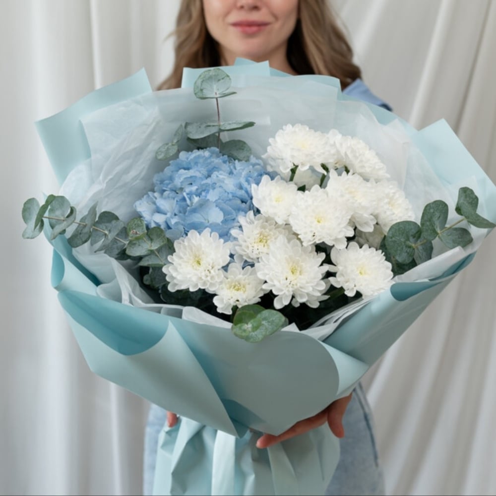 Этот утонченный букет собран из голубой гортензии и кустовых хризантем, которые символизируют долговечную красоту и изысканность. Он упакован в стильную упаковку и украшен атласной лентой, что дела...