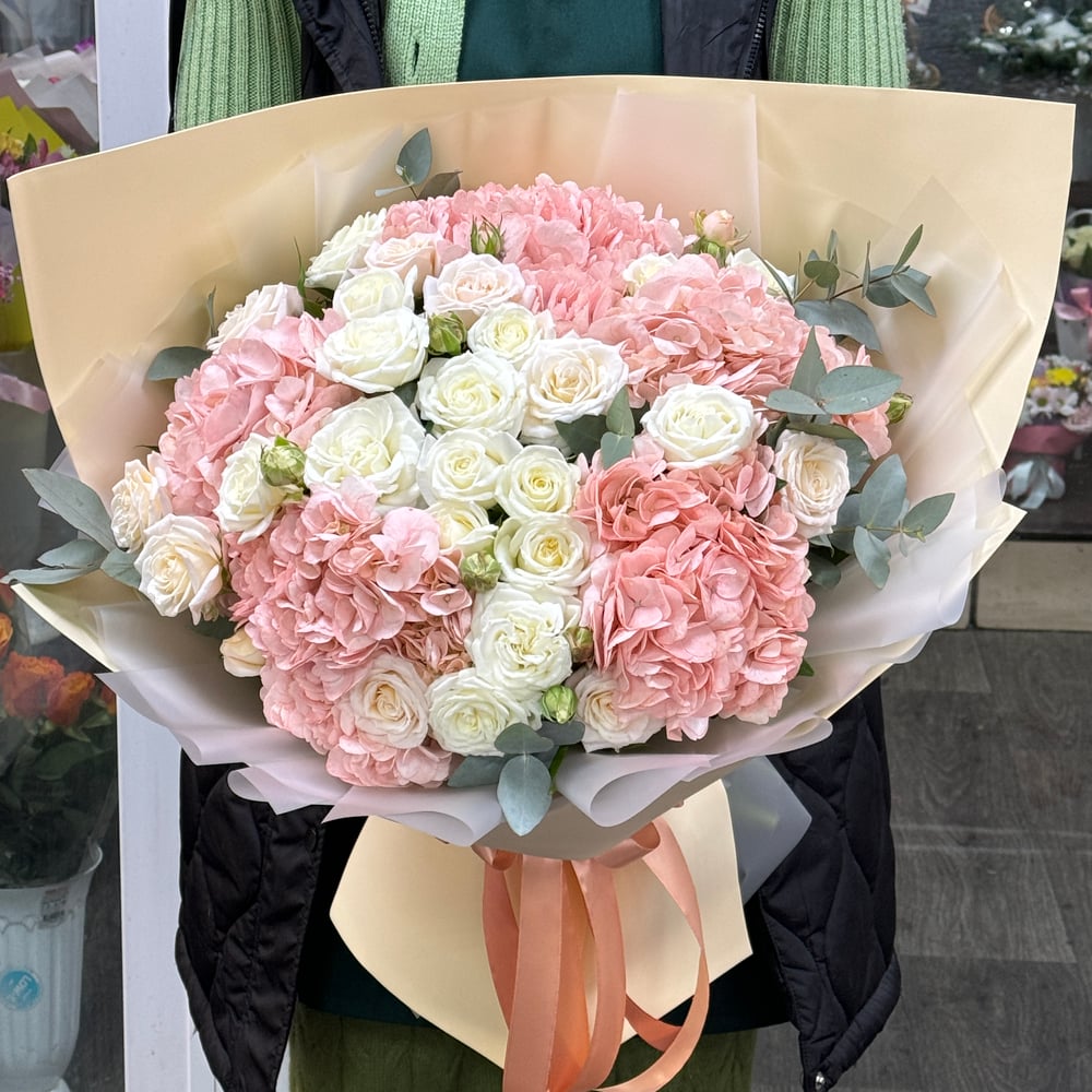 Букет из гортензии и кустовых роз