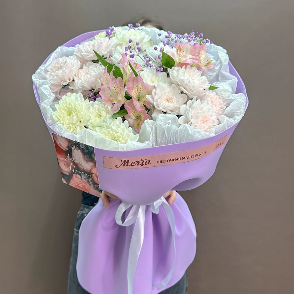 Этот утонченный букет включает в себя красочные хризантемы кустовые, изящные альстромерии и воздушную гипсофилу. Он упакован с заботой в нежное тишью, мягкий фоамиран и украшен элегантной лентой из атласа. Он станет прекрасным подарком для любого повода, олицетворяя теплые чувства и нежность.