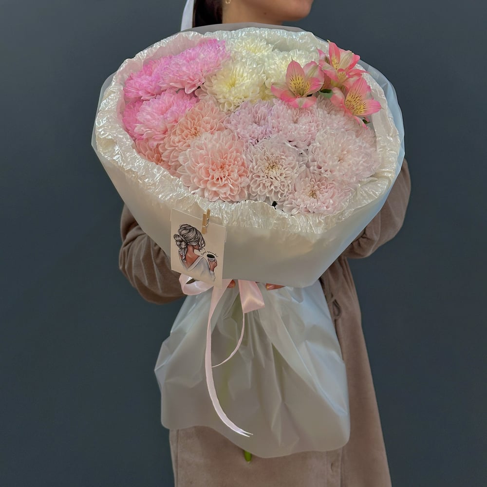 Этот букет — живое воплощение баланса и красоты природы. Яркие, насыщенные хризантемы сочетаются с изящными, разнообразными оттенками альстромерий, создавая эффект плавного перехода красок и текстур. «Гармония красок» символизирует единство, радость и вдохновение, привнося в любой интерьер ощущение свежести и жизнерадостности. Идеальный вариант для поздравлений, поддержания позитивного настроения и выражения самых светлых эмоций.