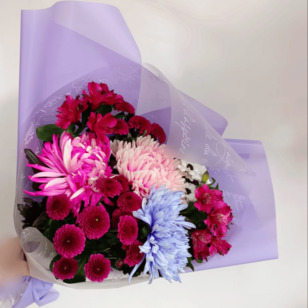 Этот изысканный букет состоит из нежных хризантем и альстромерий, создавая красивое сочетание цветов и текстур. Упаковка добавляет нотку элегантности и завершает образ композиции. Букет будет прекрасным подарком для любого случая и порадует своей красотой и свежестью.