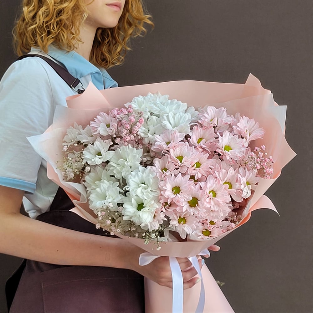 Этот нежный букет словно легкий, воздушный поцелуй, наполненный теплом и нежностью. - Хризантемы символизируют искренность и радость, придавая композиции яркость и жизнерадостность. - Легкая гипсофила добавляет воздушности и изящества, словно нежные чувства, которые хочется передать. - Вместе цветы создают гармоничный образ, который говорит о теплых эмоциях и мягкой заботе.