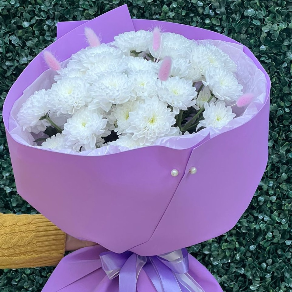 Отличный выбор! Букет из 7 кустовых белых хризантем в лавандовой упаковке будет смотреться очень нежно и элегантно. Это прекрасный подарок!