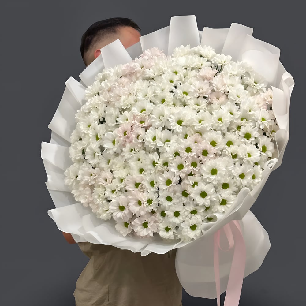 Легкий и воздушный букет, который словно наполнен солнечным светом и свежестью луга. Нежные хризантемы напоминают белоснежные ромашки, создавая эффект нежного облака из цветов. Этот букет идеально подойдет для тех, кто ценит естественную красоту и простоту, а также хочет подарить ощущение радости и легкости. Идеален для весенних и летних праздников, а также для хорошего настроения в любой день.