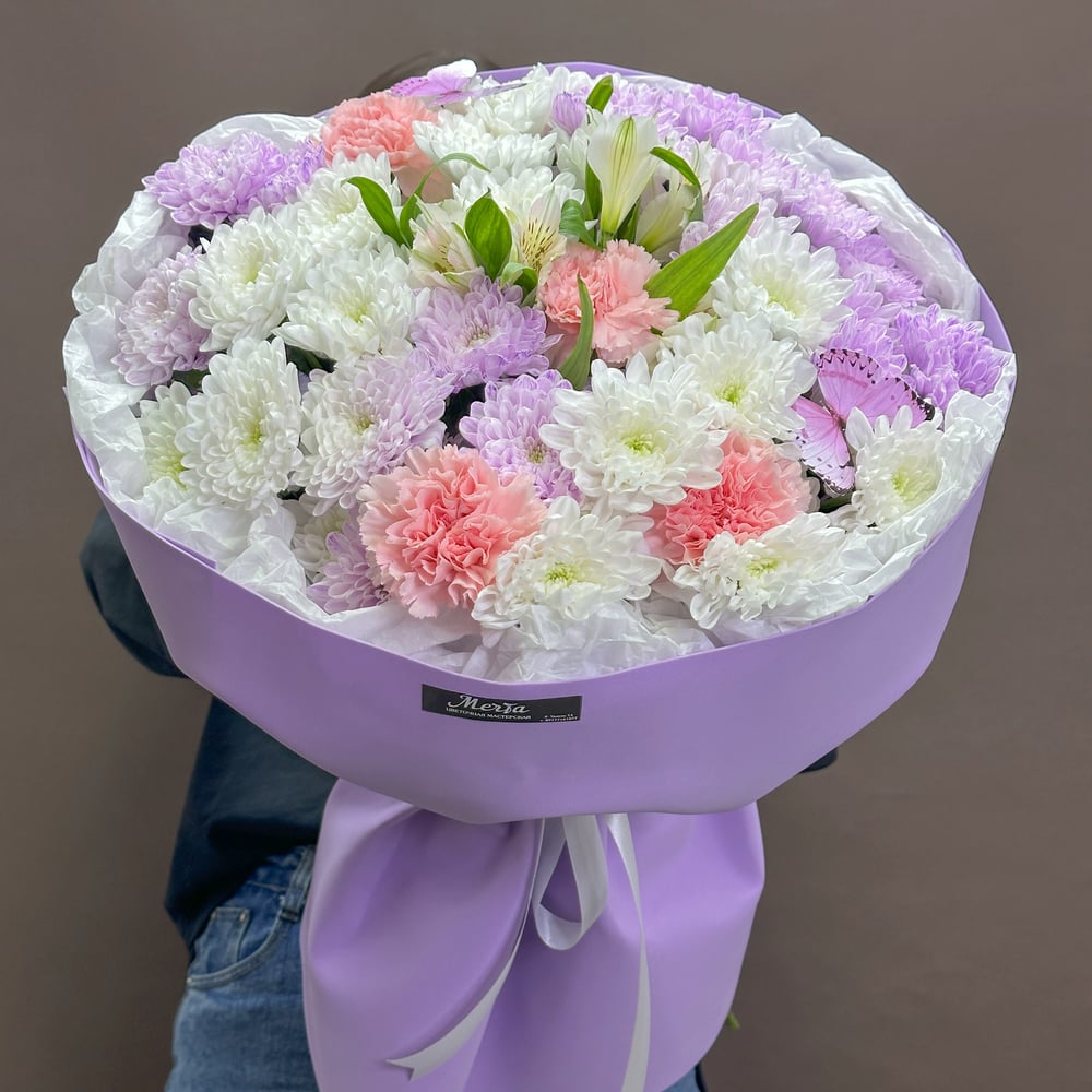 Этот изысканный букет сочетает в себе утонченность и нежность сиреневых оттенков, воплощая стиль и гармонию. Хризантемы придают композиции объём и насыщенность, диантусы добавляют изящества и тонки...