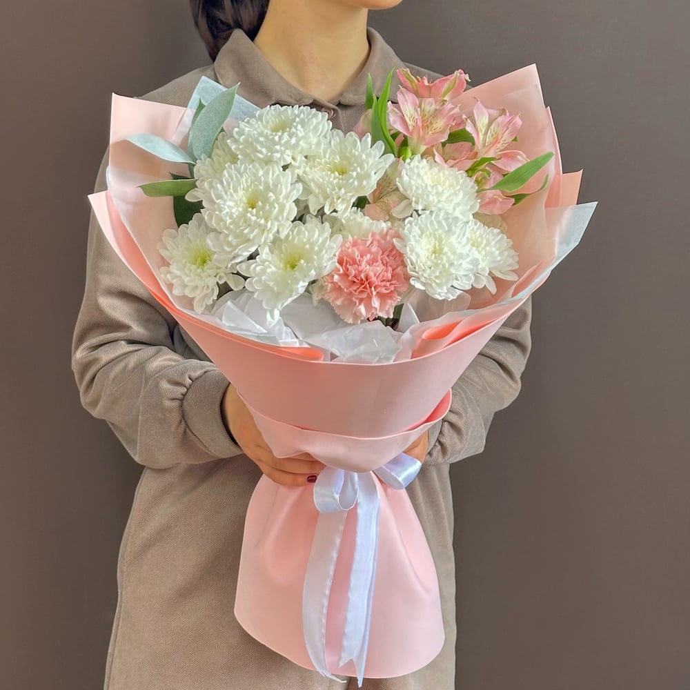 Этот букет сочетает яркие хризантемы — символ верности и долгой жизни, с нежными альстромериями, которые означают поддержку и дружбу. Яркий и свежий, букет долго сохраняет красоту и создаёт настроение тепла и веры.