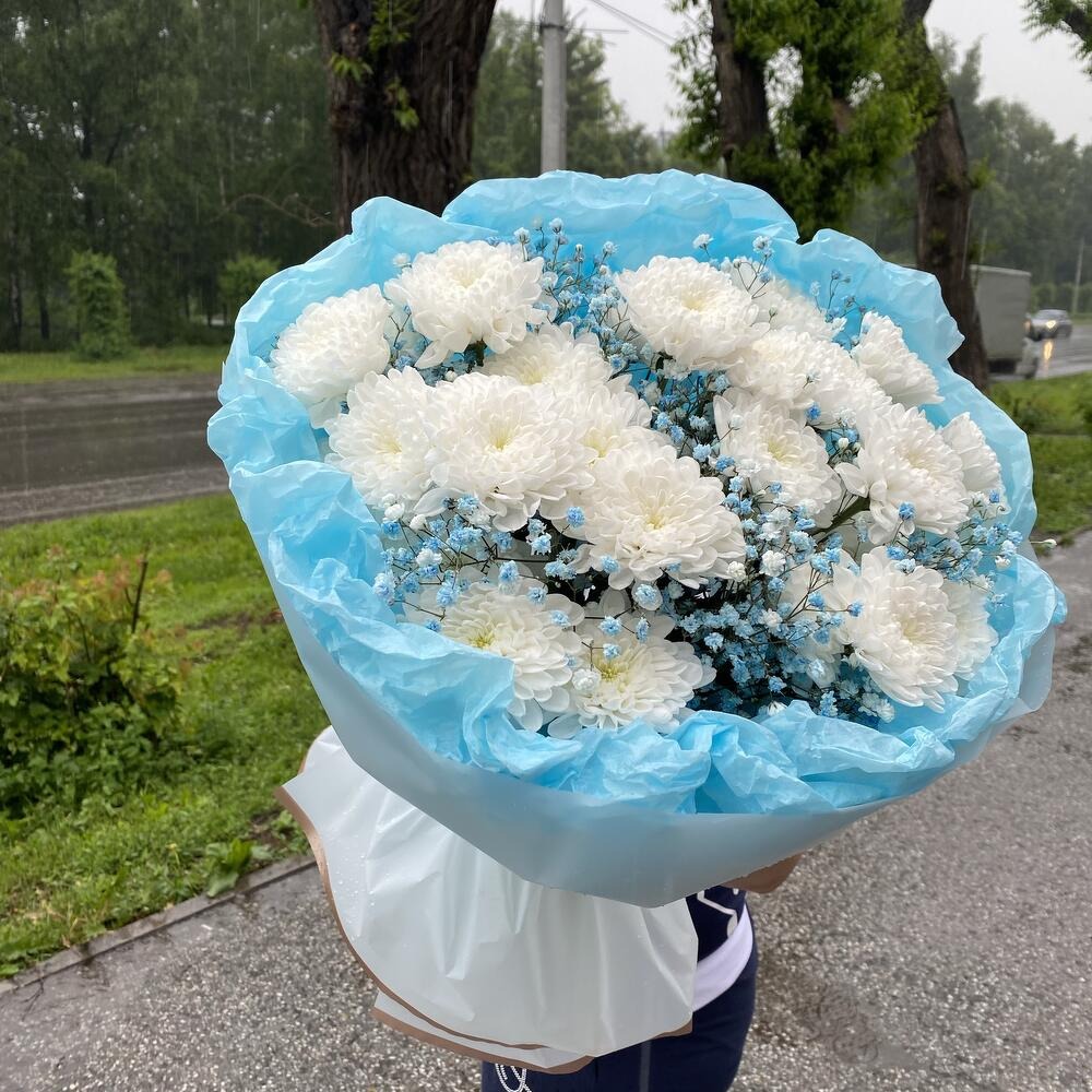 Букет из ароматных кустовых хризантем и невероятно стильной гипсофилы.