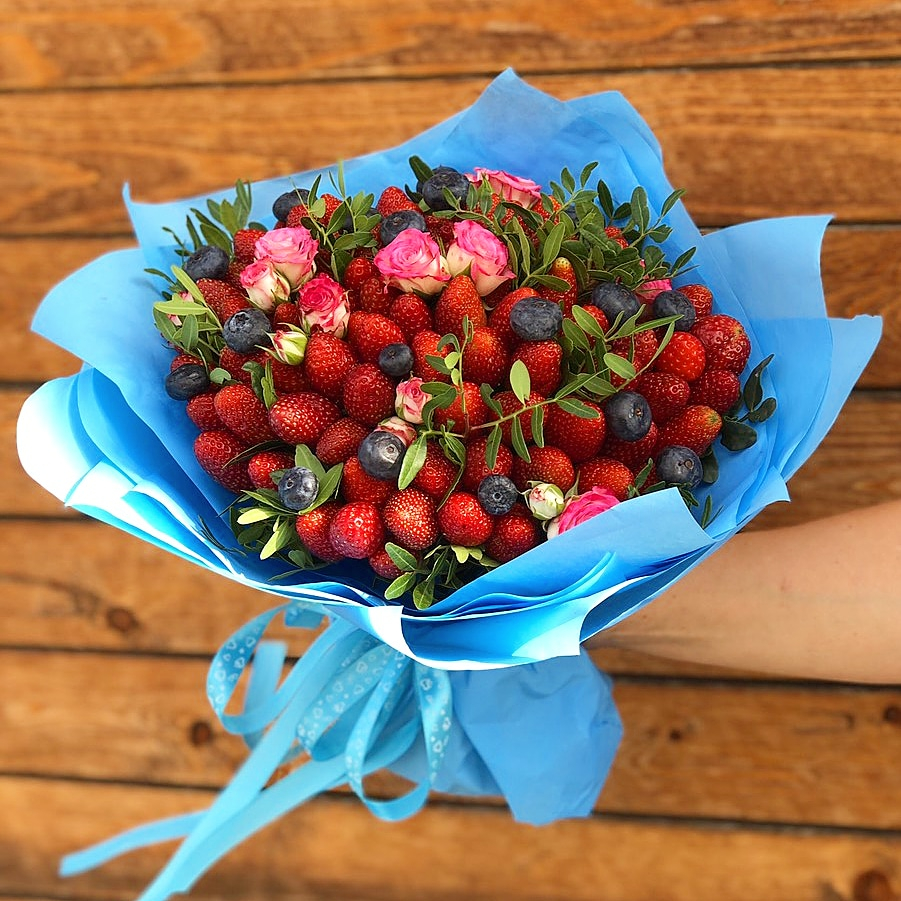 Букет из клубники, голубики и роз